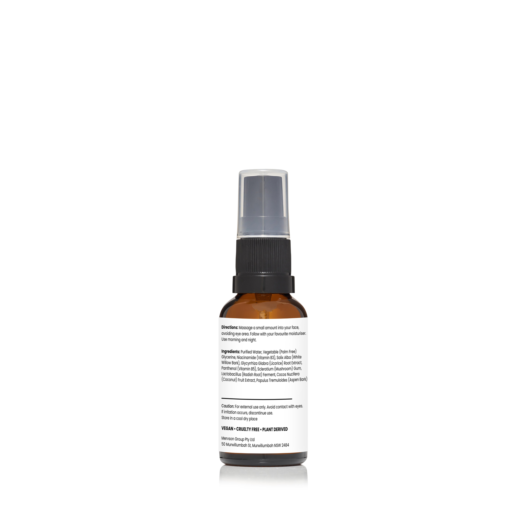 Purified Water, Vegetable (Palm Free) Glycerine, Niacinamide (Vitamin 83), Salix Alba (White Willow Bark), Glycyrrhiza Glabra (Licorice) Root Extract, Panthenol (Vitamin 85), SClerotium (Mushroom) Gum, Lactobacillus (Radish Root) Ferment, Cocos Nucifera (Coconut) Fruit Extract, Populus Trernuloides (Aspen Bark)